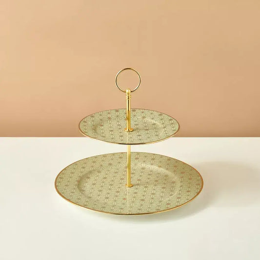 Art Deco Gold Geometric 2-Tier Cupcake Stand – Elegant Porcelain Dessert Server with Modern Appeal