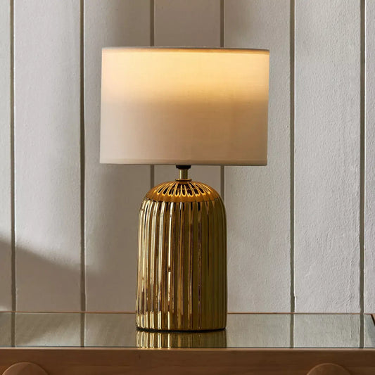 Modern Gold Ribbed Textured Table Lamp with Rectangular Fabric Shade - 38 cm