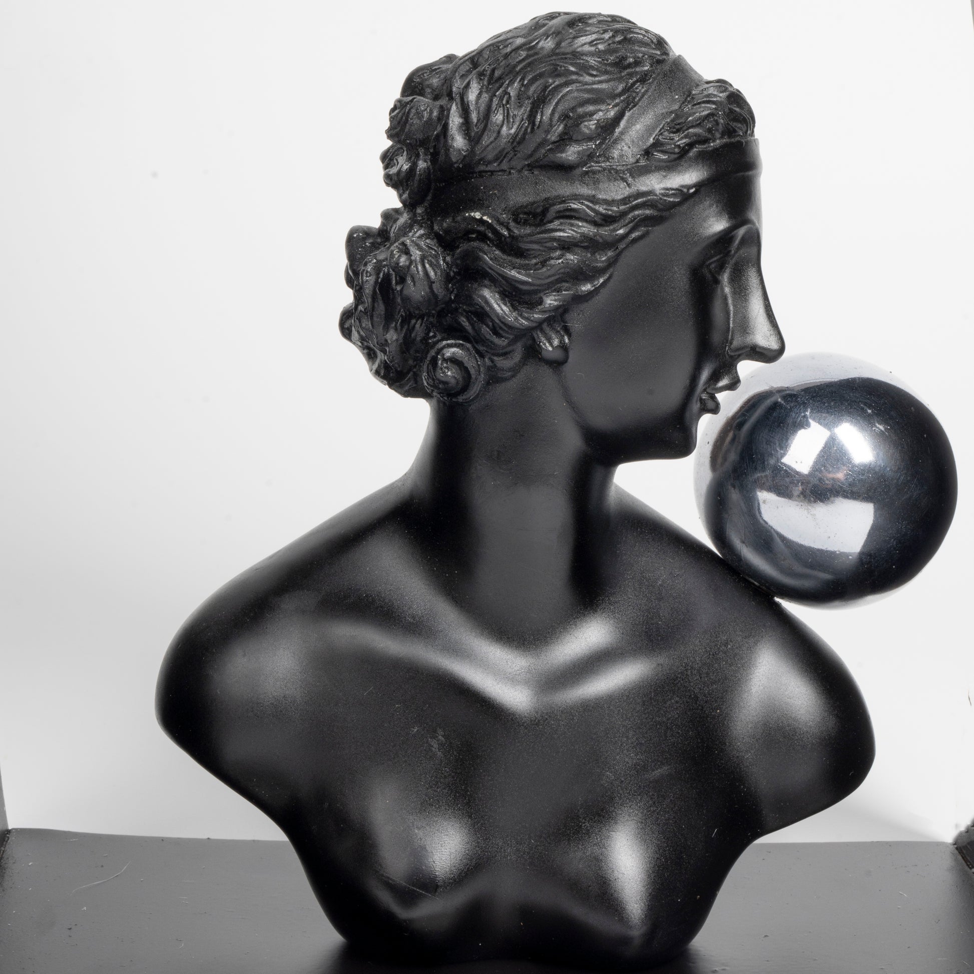 This striking modern sculpture is a captivating blend of classical form and contemporary abstraction. The piece features a beautifully detailed bust of a classical female figure, finished in a deep, matte black that gives it a sophisticated, timeless feel. The figure is framed by a sleek, black metal arch, creating a sense of a minimalist architectural space. Most notably, a large, polished silver orb appears to defy gravity, balancing on the figureโs shoulder. The reflective surface of the orb offers a stunning contrast to the matte bust, creating a powerful visual dynamic that is both intriguing and elegant.