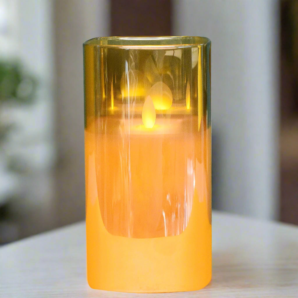 Amber Glow: Flameless LED Candle in Cylindrical Glass Holder (Medium)