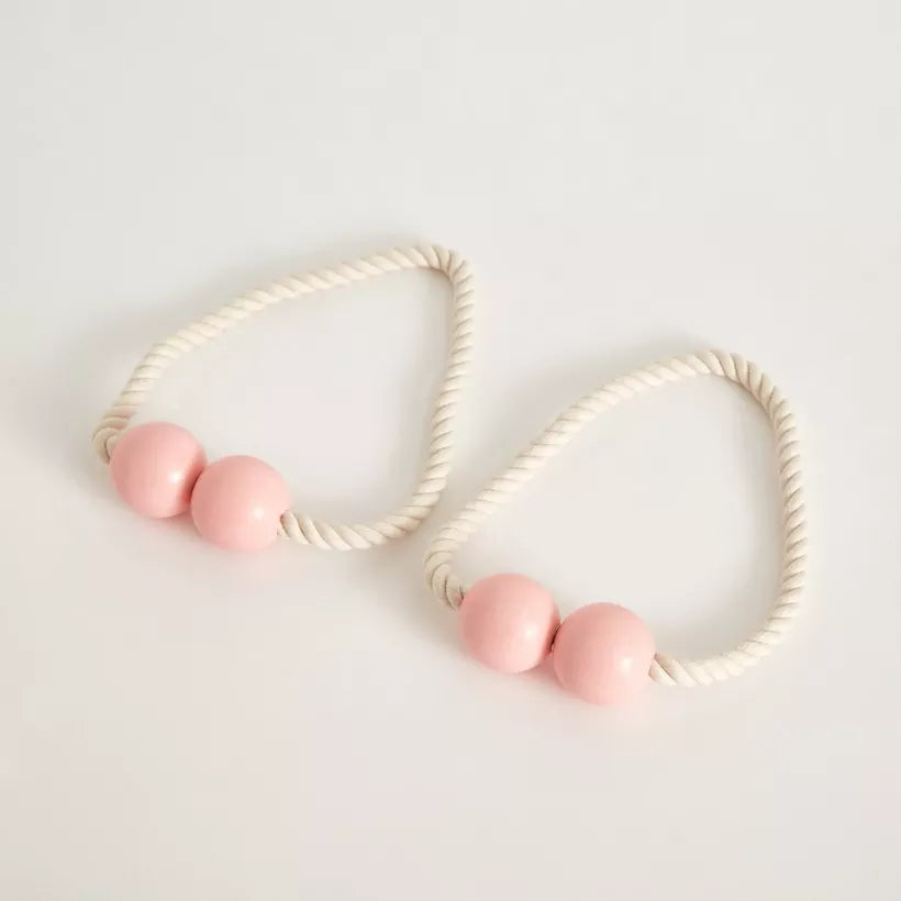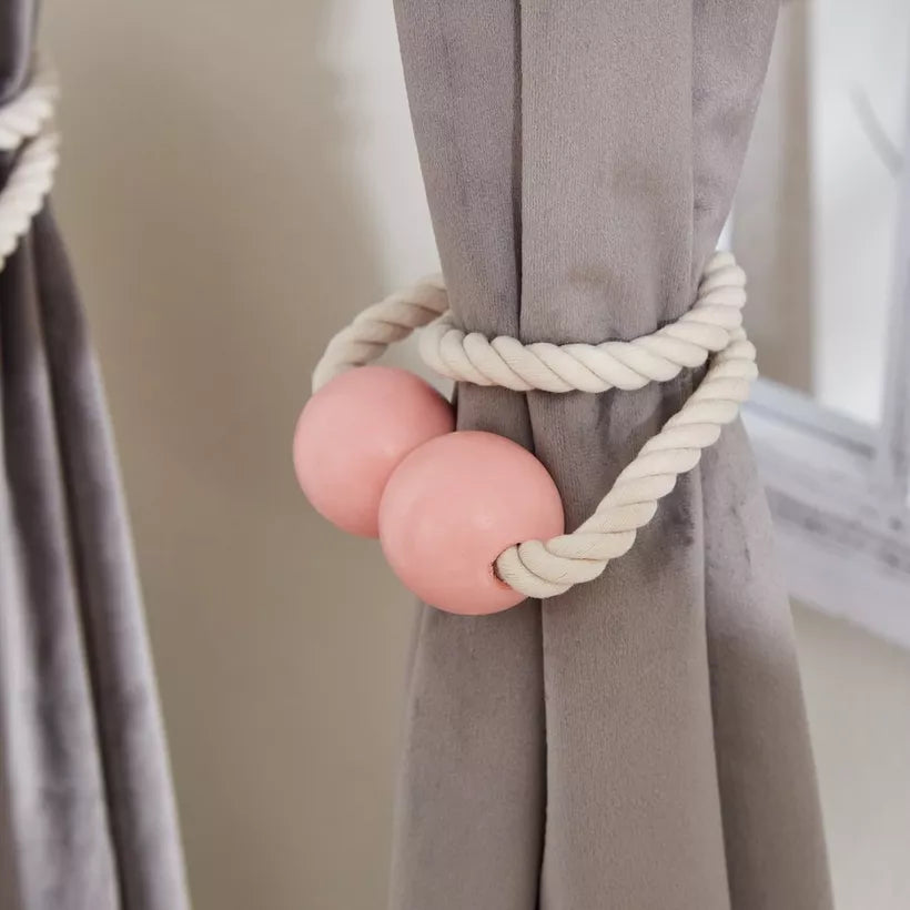 Product Overview: Add a charming touch to your window treatments with these unique Bohemian-inspired curtain tie-backs. Featuring soft, rustic rope adorned with two delightful pink wooden beads, they offer a playful yet elegant way to gather your curtains, enhancing the light and view in any room. Designed to complement a variety of curtain styles, from the plush grey velvet shown to lighter fabrics, these tie-backs effortlessly blend functionality with decorative flair.