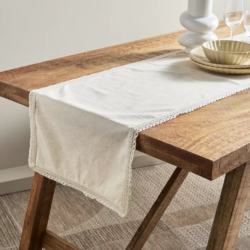 The standout feature of the "Lace Whisper" runner is its delicate, intricate crocheted lace trim that gracefully frames all four edges. This artisanal detailing adds a timeless, heirloom quality, evoking a sense of handcrafted beauty and subtle sophistication. The gentle contrast between the clean lines of the fabric and the ornate lace creates a harmonious balance, making it a perfect fit for a variety of decor styles, from chic farmhouse and shabby chic to serene minimalist and classic traditional.