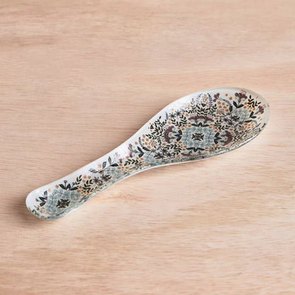 Keep your countertops clean and your kitchen organized with this exquisite and modern glass spoon rest. Its unique spoon-like shape features a stunning botanical pattern in a delicate yet detailed array of white, gray, and earthy tones, with subtle pops of rust and muted teal. The intricate design gives the impression of a beautiful, handcrafted print, making this spoon rest a stylish and functional accent for any stovetop or kitchen counter.