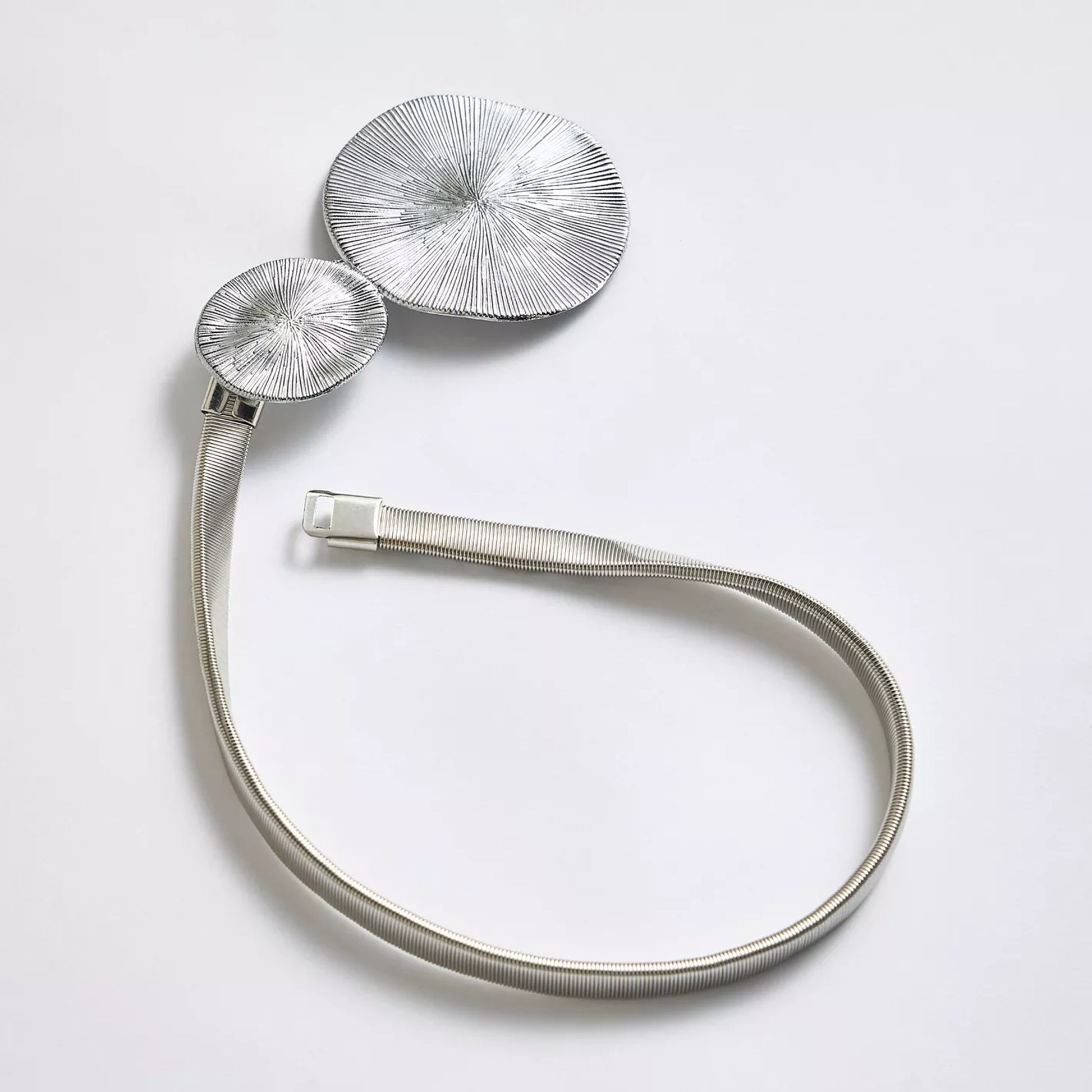 Add a touch of contemporary elegance and a hint of art deco style to your window treatments with this stunning silver curtain tie-back. This unique accessory features two textured, circular discs of varying sizes, each with a finely grooved, sunburst-like pattern that catches the light beautifully. The discs are connected by a sleek, flexible silver coil, creating a modern and sculptural look that effortlessly elevates any room.
