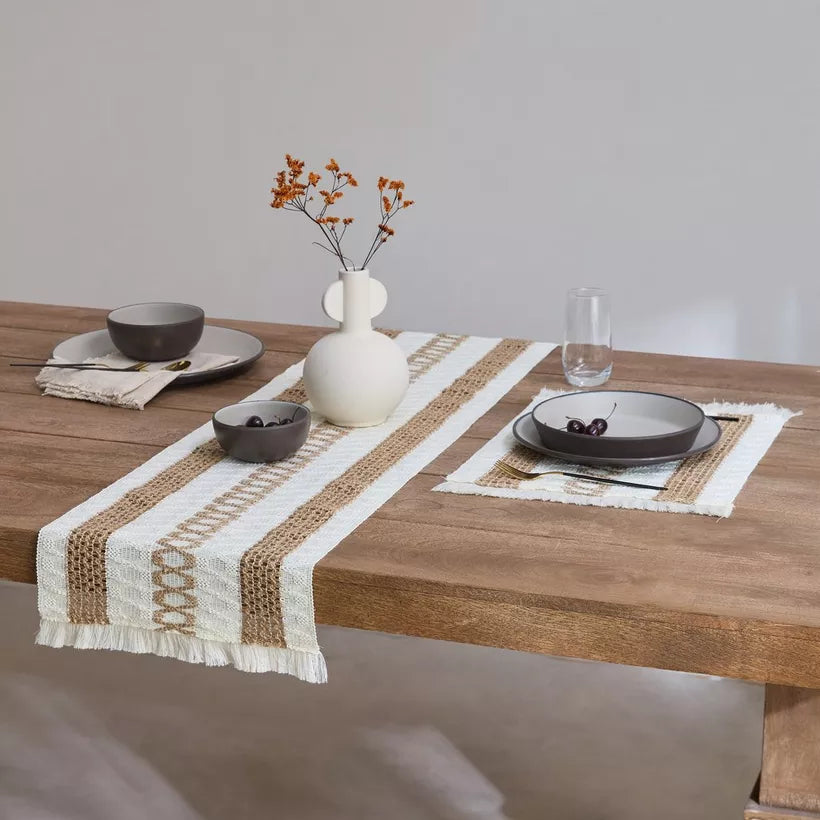 This table runner is not only visually appealing but also practical for daily use. Its versatile design allows it to complement a wide range of interior styles, from classic farmhouse and rustic to modern minimalist and eclectic. Whether you're hosting a dinner party, celebrating a holiday, or simply enjoying a quiet meal at home, our Jute & Cotton Table Runner will transform your dining table into a focal point of natural charm and understated sophistication.