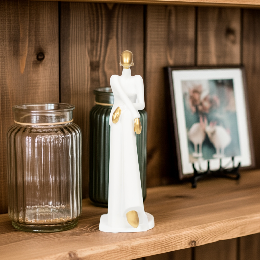 Elevate your home décor with the exquisite elegance of "The Golden Contemplation," a stunning modern sculpture that seamlessly blends form and luxury. This unique piece features a seated figure with a striking gold-finished head, hands, and feet, contrasting beautifully against a smooth, matte white body and base. The figure's graceful posture and flowing drapery evoke a sense of peaceful reflection and timeless artistry, making it a sophisticated addition to any bookshelf, console table, or office desk. Its refined design and opulent accents are sure to capture attention and admiration.